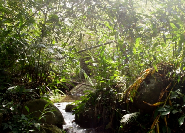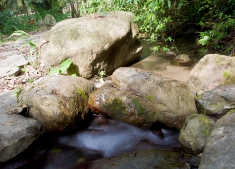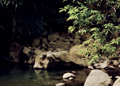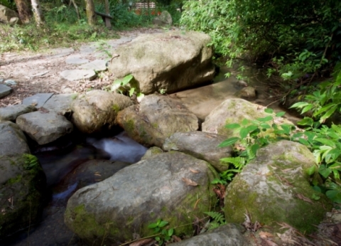 終年均溫攝氏18度C的蓬萊冷泉,林木包圍池邊,池水清澈可見游魚